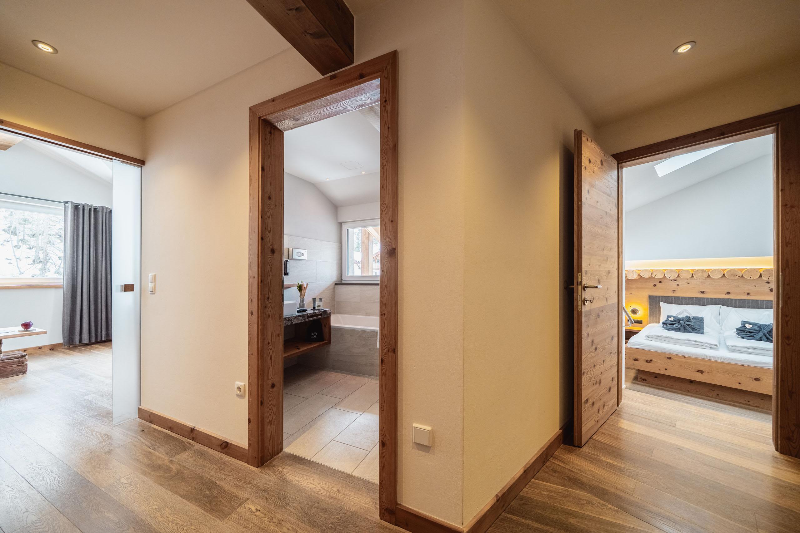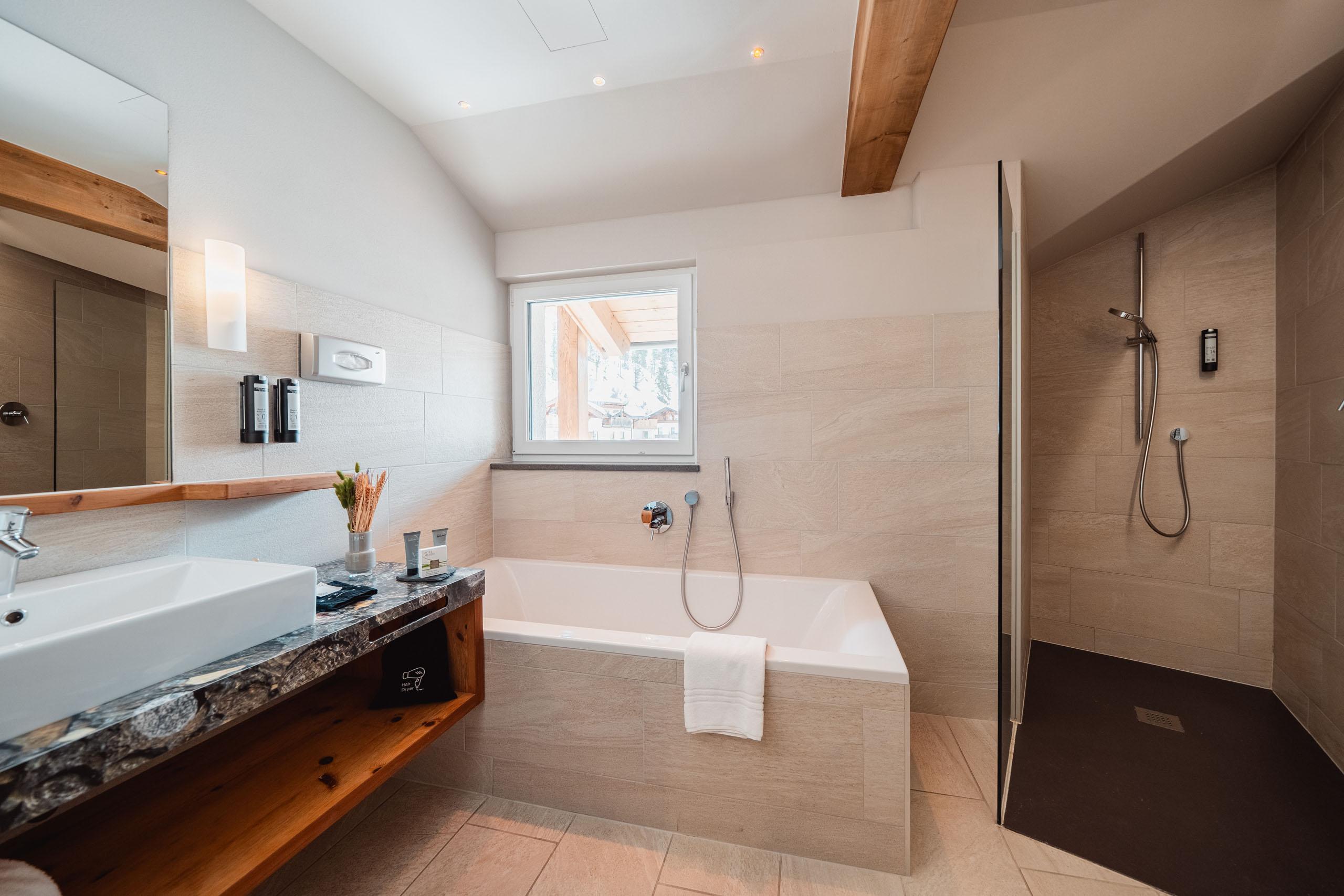 Die Romantik Suite Deluxe ist perfekt für alle, die sich ein exklusives Zimmer mit großzügigen Räumen und luxuriösen Details wünschen. Sie eignet sich besonders gut für Paare oder Familien und bietet eine warme und elegante Atmosphäre. Sie ist mit einem geräumigen Badezimmer mit Dusche, Bidet und WC, einem weiteren Bad mit WC und Bidet, Haartrockner und weichen Bademänteln, kostenlosem WLAN, TV, Telefon, Safe und einem privaten Whirlpool auf der Terrasse mit Panoramablick ausgestattet.