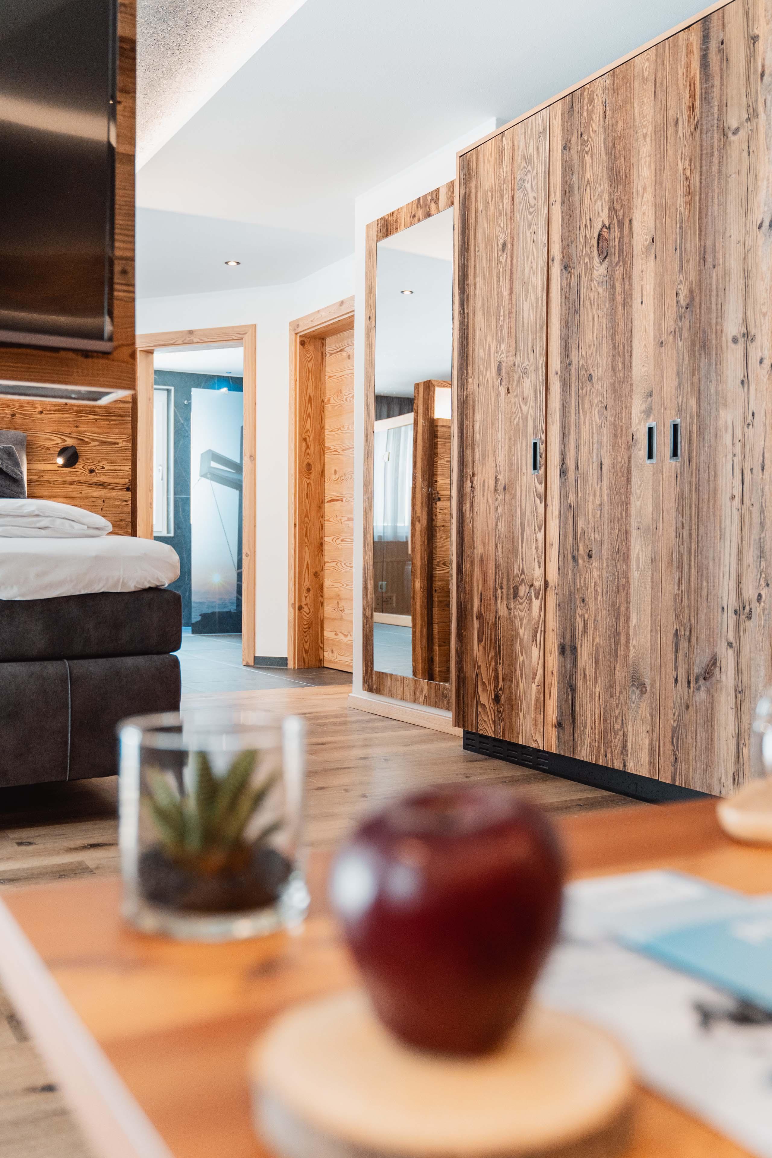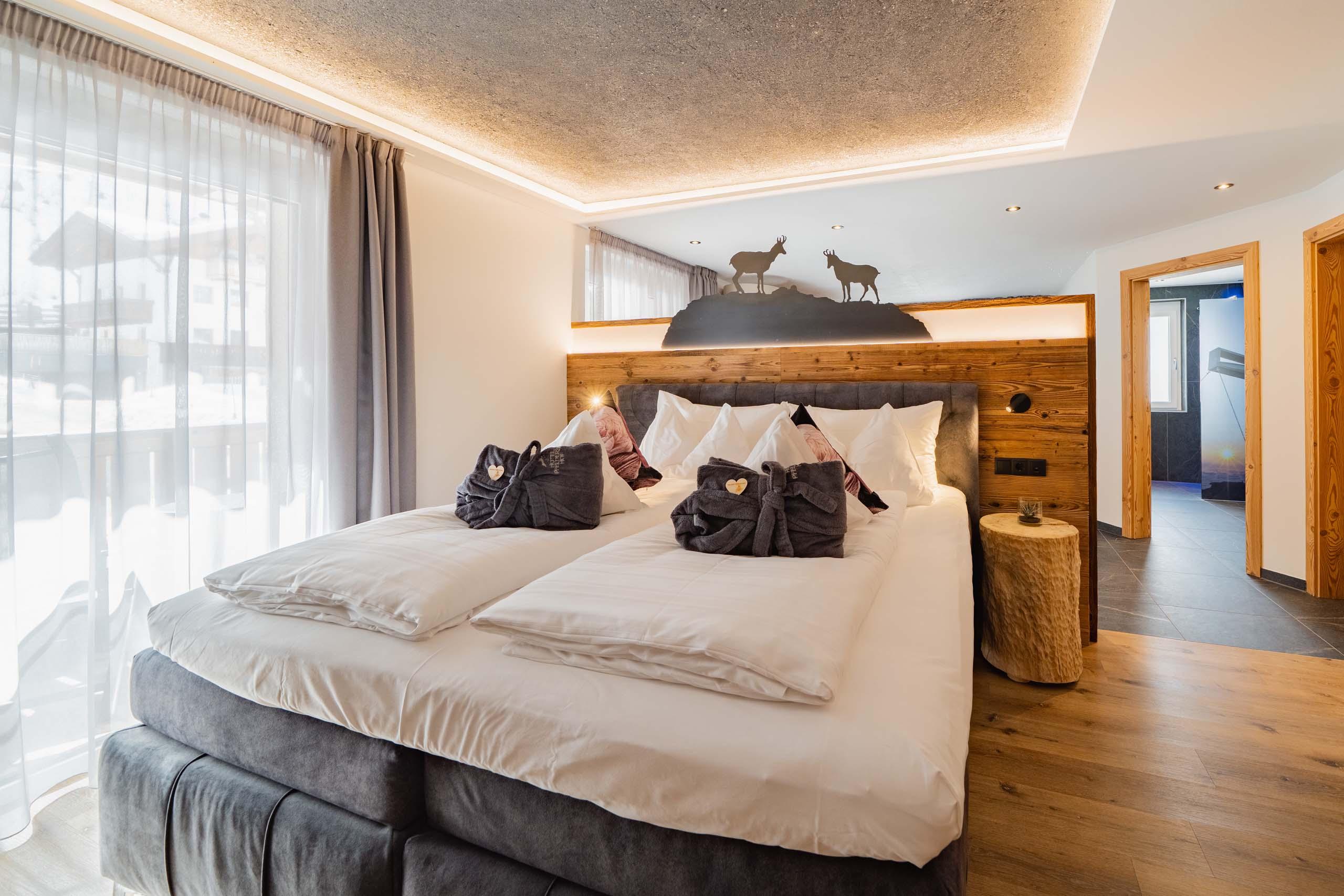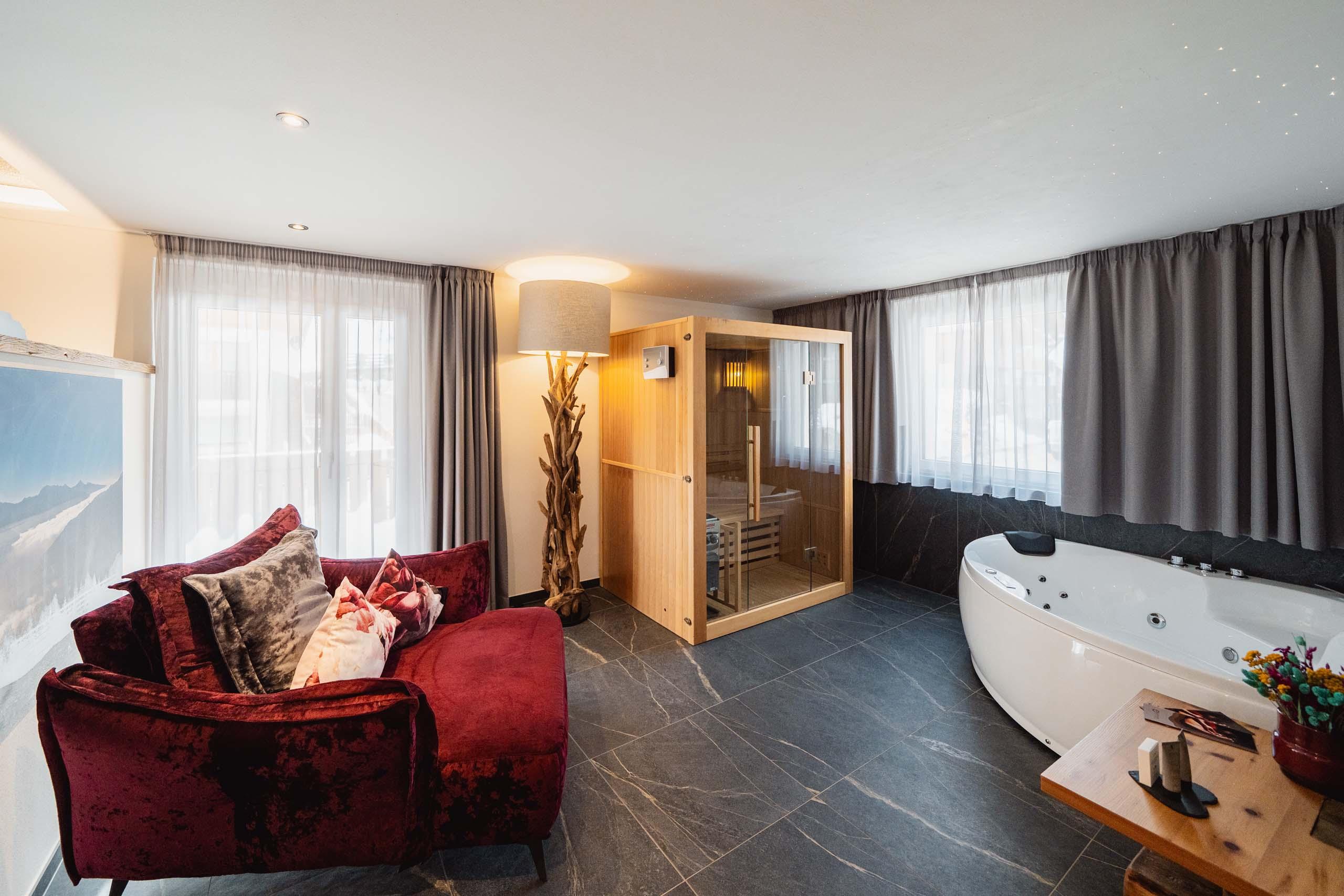 Die Romantik Spa Suite ist die perfekte Wahl für ein umfassendes Wellness-Erlebnis. Der private Spa-Bereich und der sonnige Balkon mit Bergblick schenken Momente purer Entspannung und Intimität. Die Suite verfügt über ein großzügiges Badezimmer mit Dusche, WC und Bidet, einem weiteren Badezimmer mit WC und Bidet, weiche Bademäntel und eine Wellness-Tasche, einen privaten Wellnessbereich mit Whirlpool, finnischer Sauna und Wellness-Liege, einen Wohnbereich mit Ecksofa, Minibar, 2 HD-TVs und kostenlosem WLAN sowie einen Balkon mit Sonnenterrasse und privater Liegewiese zum Sonnenbaden.